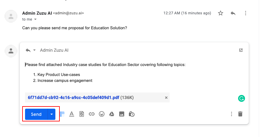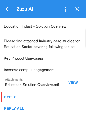 Once you click on the REPLY the Card Content along with attachments will to a draft reply. You can further edit the content and send it to your customer.